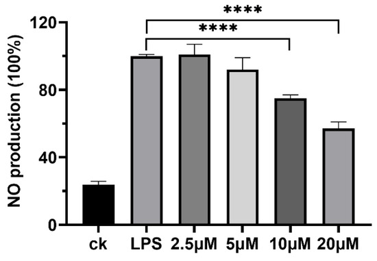 Effects of plantariitin A (1) on NO production in RAW264.7 cells stimulated by LPS. CK, NO production in the absence of LPS as the negative control; LPS, 10 μg mL−1 LPS-stimulated NO production without compound as the positive control (100%). Error bars, SD; n = 3; **** p < 0.0001.