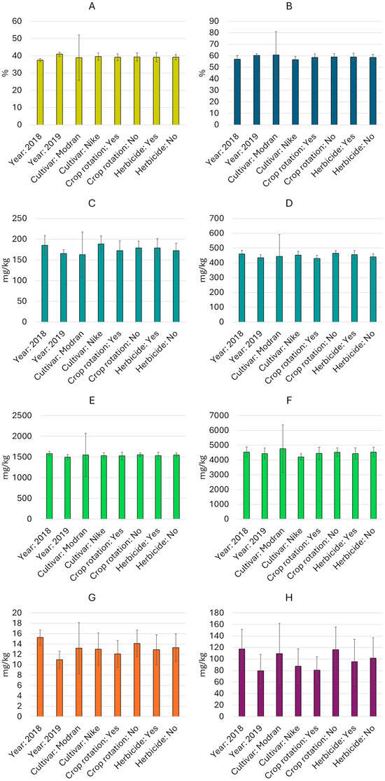 Average contents (mean value and standard deviation) of oil and selected bioactive compounds by experimental variable ((A)—oil content, (B)—ALA, (C)—plastochromanol-8, (D)—γ-tocopherol, (E)—β-sitosterol, (F)—total sterols, (G)—total carotenoids, (H)—total phenolics).