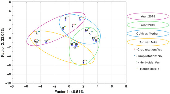 The graphic interpretation of PCA calculations for all analyzed variables is presented in Figure 2. Interpretation of these data revealed that the first two main components, PC1 and PC2, explain almost 80% of the total variance. The score plot clearly reflects differences between the samples that differed across the variables of “year”, “cultivar”, “crop rotation”, and “herbicide”. On the upper left side of the plot are samples cultivated in 2018. The lower right side of the graph shows the samples cultivated in 2019. Similarly, on the lower left side are samples from the Nike cultivar, and on the upper right side are samples from the Modran cultivar. The variables “crop rotation” and “herbicide” did not separate the samples into visible groups on the score plot. In summary, the PCA results showed that “cultivar” and “year” were the most decisive for overall oil composition.