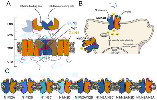 In the central nervous system of vertebrates, the primary mechanism of excitatory transmission is mediated by the neurotransmitter glutamate. As mentioned above, NMDARs are ionotropic glutamate receptors, and they are ligand-gated ion channels which are activated by glutamate []. NMDARs have an important role in synaptic plasticity, learning, and memory, as they are implicated in excitatory synaptic transmission and in the regulation of mechanisms such as LTP and LTD []. These receptors are capable of converting specific patterns of neuronal activity into long-term changes in the structure and function of synapses, which are believed to support higher cognitive functions []. NMDARs also play a role in the experience-dependent refinement of synaptic connections during development [,].