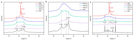 The XRD patterns of PBA, PBT, PBF, PBApFs, PBAFs, and PBATs are given in Figure 3. Consistent with the literature, PBA showed three main diffraction peaks at 21.66°, 22.38°, and 24.12°, which could be assigned to the (110), (020), and (021) reflection planes of an a-form crystal [43,47,48]. PBT showed five diffraction peaks at 17.30°, 20.48°, 23.22°, 25.26°, and 27.92°, which could be assigned to the (011), (010), (101), (100), and (111) reflection planes [49,50]. PBT showed multiple diffraction peaks with relatively strong intensities, indicating the regular packing of PBT chains in the crystalline phase and relatively high crystallinity. PBF showed three relatively weak diffraction peaks at 17.90°, 22.74°, and 25.04° [22,30]. Referring to relevant literature reports [42], the PBAp segment with the propyl branch proved to be amorphous and showed no diffraction peaks compared with PBA.