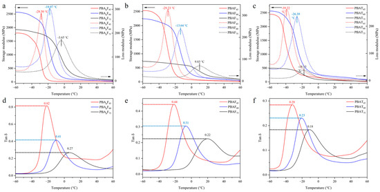 Dynamic mechanical properties of copolyesters. (a–c) the changes in the storage modulus and loss modulus of copolyesters at different temperatures. (d–f) the changes in the tan δ of copolyesters at different temperatures.
