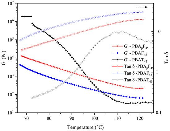 Figure 6 shows the rheological properties of PBApF45, PBAF45, and PBAT45 as a function of temperature (the rheological property curves of the other polymers are shown in Figures S20 and S21). The storage modulus (G′) of the three samples rapidly decreased with an increase in temperature. It should be noted that PBApF45 had a higher storage modulus (G′) compared with PBAF45 over the entire temperature range observed. The rheological properties were mainly affected by the following three factors [40]: the chemical structure of the chain (chain rigidity), the size of the chain (molecular weight), and the degree of entanglement (physical network). The GPC test results showed that the molecular weight difference between PBAF45 and PBApF45 was negligible (Table 1) and the rheological parameters were generally proportional to the chain rigidity. However, we observed the opposite trend, which suggests that PBApF45 had a stronger physical network. Typically, physical networks are created by either a heterostructure or a spatial entanglement of the chains [54]. The literature reports that heterostructures can be determined by evaluating the yield stress, which represents the minimum energy required for the collapse of the heterostructure [55]. It was clear from the tensile test results that the yield stress values for both polymers were close to zero (Figure 4), implying only a small amount of inhomogeneity in the molten state. Therefore, the higher G′ of PBApF45 compared with PBAF45 could fully be attributed to higher number of chain entanglements. It is conceivable that PBApFs with branches had a lower packing density because the branch points generated greater free volume, which could interdiffuse and entangle with the aromatic segments more efficiently.