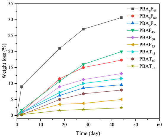 It is necessary to study the enzymatic degradation of copolyesters when developing novel bio-based biodegradable materials. In this paper, the enzymatic degradation of the copolyesters using porcine pancreatic lipase was detected in a phosphate buffer solution at 37 °C. As shown in Figure 7, the degradation speed strongly depended on the copolymer composition; the greater the aromatic units, the slower the degradation. For copolyesters PBApF45, PBApF60, PBAF45, PBAF60, and PBAT45, the weight loss linearly increased with time within 45 days of enzymatic degradation, and the maximum weight losses were 30.7, 17.3, 19.8, 12.7, and 11.6%, respectively. For PBAF75 and PBAT75, the maximum weight loss was less than 5.0%, which indicated that they could not be degraded by porcine pancreatic lipase, which was consistent with the data reported in the literature under the same enzymatic hydrolysis conditions [39].