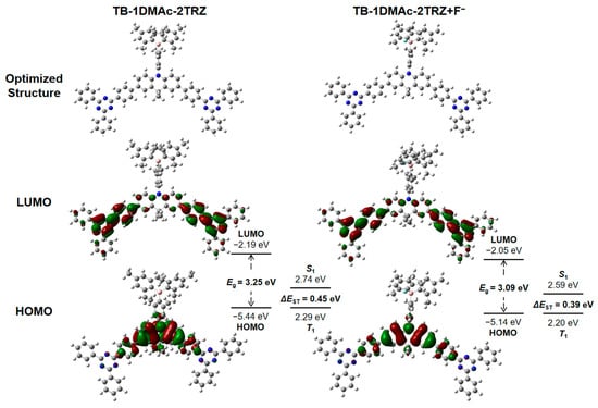 | TB-1DMAc-2TRZ | 272/411 | 522 | 432 | 206 | 2.74/2.29 | 0.45 | −5.44/−2.19 | 3.25 |