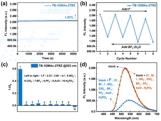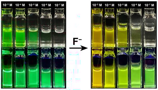 - Qi, Y.; Cao, X.; Zou, Y.; Yang, C. Multi-resonance organoboron-based fluorescent probe for ultra-sensitive, selective and reversible detection of fluoride ions. J. Mater. Chem. C 2021, 9, 1567–1571. [Google Scholar] [CrossRef]