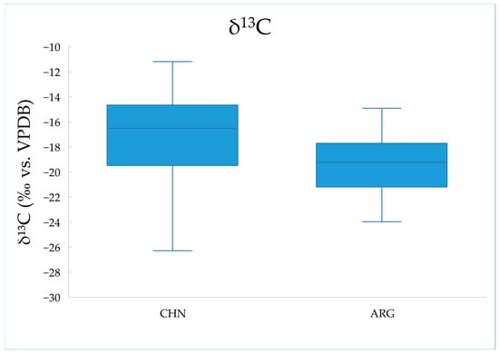We measured the carbon stable isotope ratios of 83 samples. The mean δ13C values and standard deviations of samples from China and Argentina are summarized in Table 2. A boxplot illustrating the δ13C distribution is shown in Figure 1.