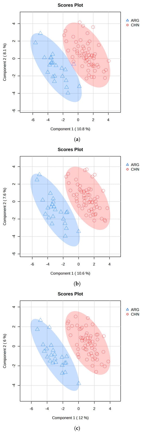 PLS-DA classification model of Chinese and Argentine beef samples. (a) is the PLS-DA classification plot based on elemental properties; (b) is the PLS-DA classification plot based on both elemental and carbon stable isotope properties; (c) is the PLS-DA classification plot after removing redundant variables from (b). The blue and red shadow is the 95% confidence interval of PLS-DA models, it means the model’s classification of beef samples origin.