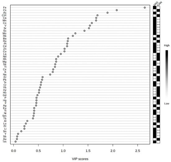 The PLS-DA model can also optimize classification results by removing redundant variables. The classification ability of the PLS-DA model depends on the correlation between the variables and the class labels. If there are many irrelevant or redundant variables, they may be treated as noise and introduced into the model, which could interfere with the model, reducing its performance and robustness [33,34,35]. VIP (Variable Importance in Projection) is an indicator used to assess the importance of each variable (feature) to the model. It helps identify which variables contribute most to the model’s predictive ability, allowing the selection of variables that have the most impact on classification or regression results. Variables with low VIP values are less important to the model and can be discarded to improve classification accuracy [36,37]. By evaluating the VIP values of the model and re-modeling, redundant variables such as Tm, Au, Pr, Sb, Y, Tb, Eu, and Sm, which contribute less to the model, were removed. The classification model results after this adjustment are shown in Figure 2c. From the results, it can be seen that the samples within the same region are now more tightly clustered, the 95% confidence interval has narrowed, and the differentiation between regions is more prominent. The 10-fold cross-validation results are shown in Table 2, where the classification accuracy for beef from the two regions is 98.8%, with an R2 of 0.925 and a Q2 of 0.787. Compared to the model trained with single-variable data, R2 and Q2 have improved by 1.05% and 11.47%, respectively. This demonstrates that removing redundant variables significantly enhances the model’s predictive capability.