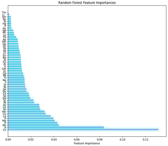 In the Random Forest algorithm, feature importance is used to assess the contribution of each sample attribute to the classification model (Figure 5) [43,44]. The top ten ranked variables in terms of importance are Cs, K, Rb, V, Mg, P, La, Cu, Mo, and Fe. Among these, K, Cs, Rb, V, Mg, P, La, and Fe overlap with the VIP values from the PLS-DA model and the elements with the most significant differences in the elemental data. Therefore, these eight variables are key factors that differentiate beef origin. The Random Forest Feature Importances are shown in Figure 5, where the contribution of sample attributes to the model is ranked from smallest to largest. The top ten variables in terms of importance are Cs, K, Rb, V, Mg, P, La, Cu, Mo, and Fe. The classification prediction results for the test set are presented in Table 5, with an overall prediction accuracy of 82.35%.