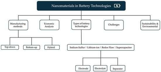 Furthermore, this paper examines the common manufacturing processes employed in the production of these modern energy storage devices, particularly those utilizing nanostructured materials. We also address the challenges and potential solutions associated with incorporating nanomaterials into energy systems, including issues such as stability, scalability, and safety concerns. An economic analysis is presented, outlining the costs associated with developing and deploying these cutting-edge energy storage technologies. Finally, this paper unravels the sustainability and environmental implications of utilizing nanomaterials in battery production and their potential impact on the environment. Figure 1 presents a visual representation outlining the structure of this review paper.