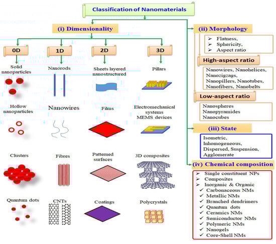 Interestingly, materials may display peculiar characteristics that are very different from those of mesoscale materials [15,16,17]. Chemical composition is important in the classification of nanomaterials. Compared to mesoscale materials, nanomaterials display unique chemical, visual (optical), and electrical characteristics. For instance, gold (Au) nanoparticles (NPs) can be synthesized by the combination of sono-electrochemical and ultrasonic vibration. Carbon-related nanoscale nanomaterials exhibit a wide range of physical and chemical characteristics in their field of application, which makes them more attractive. The various classes of nanomaterials are shown in Figure 3.