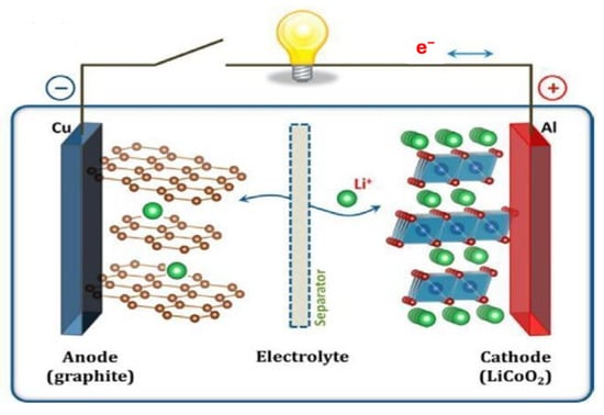 Li-ion batteries are vital in modern rechargeable batteries. Generally, current cathode materials used include LiCoO2, LiMn2O4, LiFePO4, and LiZO2, while graphite is used as anode. Moreover, LiPF6 salt is dissolved into one or more carbonate-based solvents for an ionic conductor solution called an electrolyte. Polypropylene (PP) is employed as a separator for restricting electron flow. The current collector (aluminum) is used on the positive electrode side, while copper is used on the negative electrode side. LiBs have more advantages, like high charging/discharging capacity, high life cycles, and ease of carrying (compared to other batteries like lead acid and Ni-based batteries). However, the higher energy densities of LiBs are limited (specific capacity 372 mAh/g for graphite anode as well as 100–400 mAh/g for oxide cathode) to meet the current demand of the world [19]. A LiBs system is shown in Figure 4, where Li-ions can transmit between the anode and cathode through the electrolyte and separator.
