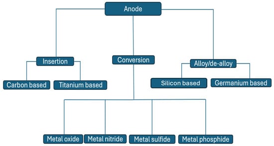 Negative electrode/anode materials play an important role in the various components of LiBs. The nanomaterials in the anode of LiBs are vital for fostering lithium intercalation and deintercalation more than bulk materials, resulting in improved capacity and high electron collection efficiency [21,22]. In Figure 5, three types of nanomaterial anodes of LiBs are illustrated. Also, insertion materials come in two forms: carbon-based and titanium based. Conversion materials are metals with oxides, sulfides, phosphides, and nitrides. Alloy materials are generally silicon, carbon, or germanium based. Figure 5 and Figure 6 show the various classes of anode materials and their potential voltages, while Table 1 compares the negative electrode nanomaterials used in LiBs.