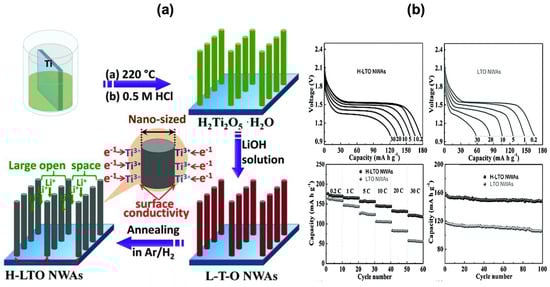 Intercalated titanium-based oxide anode is important in LiBs because it has intrinsic characteristics such as improved safety during cycling, no change in volume, among others. However, low ionic conductivity and very limited theoretical capacity (nearly 175 mAh/g) are major issues for large-scale industrial productions [23]. To address these issues, Shen et al. [57] designed a nanostructured material (LTO-nanowire arrays), which grows on titanium foil for improving ionic conductivity by making Ti+3 ions through hydrogenation (see Figure 8). These titanium foils containing nanowires demonstrated excellent rate performance because the theoretical capacity value is close to practical capacity (173 mAh/g at 0.2C rate) with better cycle life when utilized as electrodes directly, without the need for conductive binders or additives. The cycling performance achieved a 95% capacity retention after 100 cycles at 5 °C.