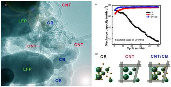 (a) Modification of the LFP cathode with CNT or CB (TEM images), (b) cycle number vs. capacity relation with CB, CNT, and CNT/CB. (c) Schematic of CB (red spheres), CNT (gray tubules), and CB/CNT network as a conductive additive for LiFePO4/C (green spheres) composite cathodes. [131]. © ACS, 2014.
