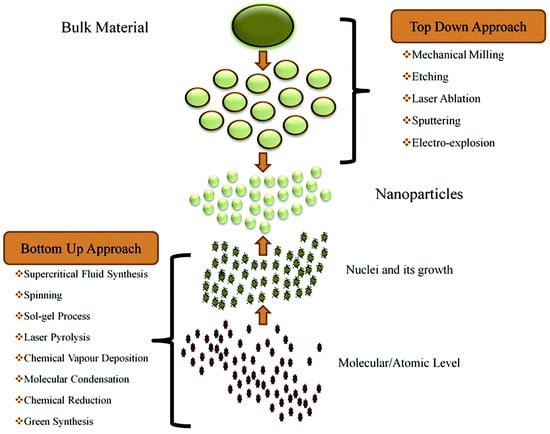 The United States National Nanotechnology Initiative denotes nanotechnology as the manipulation of materials that are within a scale between 1 and 100 nanometers [6]. Recent nanotechnology research is concentrated on bottom–up, top–down, and hybrid approaches [7,8,9,10,11,12,13]. Figure 2 shows the applications of nanomaterials in different fields.