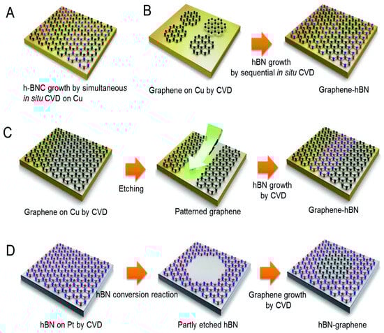 - Wu, Q.; Wongwiriyapan, W.; Park, J.-H.; Park, S.; Jung, S.J.; Jeong, T.; Lee, S.; Lee, Y.H.; Song, Y.J. In Situ Chemical Vapor Deposition of Graphene and Hexagonal Boron Nitride Heterostructures. Curr. Appl. Phys. 2016, 16, 1175–1191. [Google Scholar] [CrossRef]