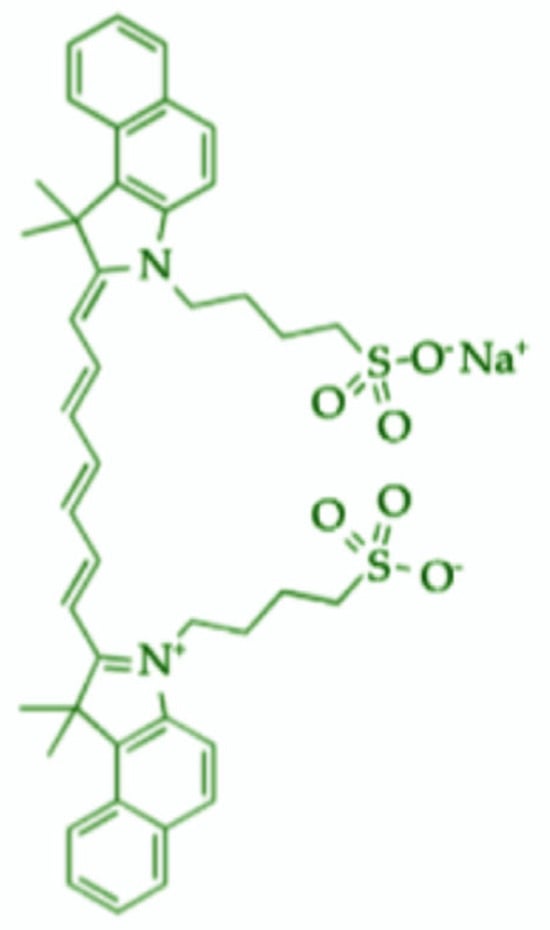 The scientific and medical communities have shown a great deal of interest in indocyanine green (ICG) (Figure 1), a water-soluble synthetic dye, due to its unique chemical properties and numerous applications [1]. Initially created in the 1950s, it is primarily used for diagnostic purposes, ranging from liver and heart function tests to ocular imaging [2]. As a fluorophore with biological activity, this compound serves both diagnostic and therapeutic functions. This section explores the chemistry, biological activity, and applications of the dye, focusing on medical imaging and clinical diagnostics [3]. The mentioned compound belongs to the heptamethine cyanine dye subclass, characterized by conjugated double-bond systems that enhance its optical properties [4]. The molecular structure consists of a core aromatic ring system and two indole or indoline rings joined by a polymethine chain, contributing to its vibrant color and ability to absorb and release light at specific wavelengths [5].