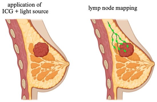 Bargon CA. et al. aimed to compare the sentinel lymph node (SLN) detection rate of ICG fluorescence imaging (Figure 4) with the standard 99mTc-nanocoilloid used in sentinel lymph node biopsy (SLNB) for breast cancer. A total of 102 patients with early-stage, clinically node-negative breast cancer was enrolled and underwent SLNB, first using ICG-fluorescence imaging, followed by confirmation with 99mTc-nanocoilloid using a gamma probe. The primary outcome, the detection rate, was defined as the proportion of patients with at least one SLN detected by either tracer. The results showed that the detection rate for ICG fluorescence was 96.1%, significantly higher than the 86.4% detection rate for 99mTc-nanocoilloid. However, the detection rates for pathological SLNs were identical at 86.7% for both methods, and ICG fluorescence did not increase the detection time, with no adverse events reported. This study concluded that ICG fluorescence demonstrated a higher SLN detection rate than 99mTc-nanocoilloid, with equivalent detection of pathological SLNs, suggesting that ICG fluorescence is a safe and effective alternative for SLNB in early-stage breast cancer patients [107]. Further studies have highlighted the advantages of ICG in breast cancer procedures. For instance, a prospective trial involving 88 patients found that ICG had a detection rate of 96%, compared to 93% for the traditional radioisotope 99mTc, with a combined detection rate of 99%. Importantly, ICG detected all macrometastatic nodes without complications, supporting its role as a viable alternative to radioisotopes for sentinel lymph node biopsy [108].