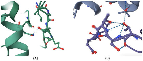 A comparison of the selected APC1 10-amino acid target site, 1236-LPPTSTELDV-1244, in the APC/C-CDC20-bound form and the APC/C-CDH1-bound form of APC1. (A) The modeled interaction between an N-terminal human CDC20 alpha-helix (left in green) and the APC1 target site (right in green) via a single hydrogen bond targeting threonine 1241 (dotted line) (RCSB PDB accession number 5G04). (B) The modeled interaction between a human CDH1 alpha-helix (top in purple) and the APC1 target site (bottom in purple) via a single hydrogen bond targeting threonine 1241 (dotted line) (RCSB PDB accession number 9GAW). Note the distortion of the APC1 target site in the CDH1-containing APC1 model through threonine 1241 forming additional hydrogen bonds with adjacent amino acid residues in the APC1 target site (bottom in purple).
