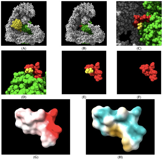 The geometrical and physical–chemical landscapes of the APC1 10-amino acid 1236-LPPTSTELDV-1244 target site (RCSB PDB accession number 5G04). (A,B) The APC/C (gray) holo-enzyme complex is visualized bound to CDC20 (yellow) or, in its absence, with the APC1 subunit of the complex labeled in green. The 10-amino acid target site on the surface of the APC1 is labeled in red. (C) The alanine from CDC20 that is modeled to interact with APC1 at the target site via a single hydrogen bond, displayed in yellow. (D–F) The 10-amino acid APC1 target site (red) displayed in a different orientation and in the absence of other APC/C subunits or in the absence of the remaining part of the APC1 (green), with the alanine from CDC20 that is modeled to interact with APC1 at the target site via a single hydrogen bond displayed in yellow. (G) The electrostatic potential landscape of the target site. Electronegativity is displayed in red, while electrically neutral regions are shown in white. The target, threonine 1241, is electrostatically neutral, while C-terminal aspartic acid 1243 displays the strongest potential, in red and toward the right. (H) The hydrophilic landscape, shown in aqua green, and the hydrophobic landscape, shown in yellow, of the target site reveal the bipartite nature of the target. The target, threonine 1241, is slightly polar in nature.