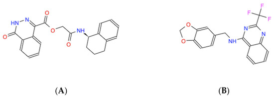 The candidate molecules all share amphipathic structural elements, such as central polar chemical motifs containing nitrogen and/or oxygen combined with dual antipodal hydrophobic ring structures that likely facilitate the modeled interactions, as revealed by their skeletal structural formulas (Figure 3).