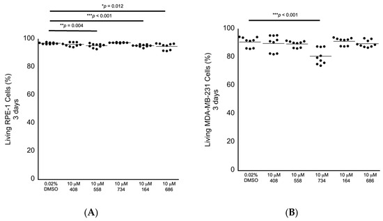 Cytotoxicity screening for 3 days as investigated by FACS analysis. (A) RPE-1 genomically stable diploid control cells displayed a small level of non-specific cytotoxicity in response to being exposed to 10 μM 558, 164 or 686. (B) MDA-MB-231 genomically unstable aneuploid breast cancer cells displayed a sensitivity to 10 μM 734 after being exposed for 3 days. All samples: n = 3 biological replicates; n = 9 technical replicates; one-way ANOVA; * p < 0.05; ** p < 0.01; *** p < 0.001.
