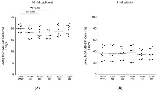 Screening for anti-cancer cell bioactivity in MDA-MB-231 breast cancer cells in combination with drugs that are proposed to act via increasing the levels of multipolar mitotic spindles. (A) Living MDA-MB-231 cancer cells in combination with the clinically relevant dose of 10 nM paclitaxel, where the small molecules 558 and 734 displayed significant differences compared to the 0.02% DMSO control. (B) Living MDA-MB-231 cancer cells in combination with the likely clinically relevant dose of 1 nM eribulin, where none of the small molecules displayed significant differences compared to the 0.02% DMSO control. All samples: n = 3 biological replicates; n = 9 technical replicates; one-way ANOVA; * p < 0.05; ** p < 0.01.