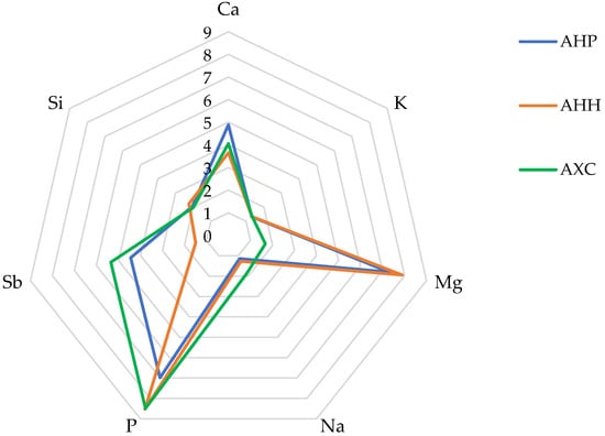 - Phosphorus (P): Occupies the second position in abundance; however, in AHP, its average content is approximately 20% lower than in AHH and AXC;