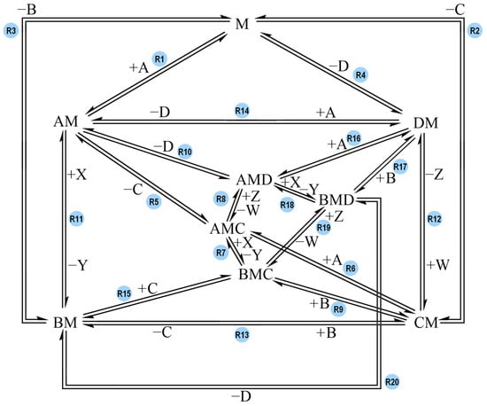The network that connects all these species links the species together through all the possible reactions. This network features twenty reaction steps, presented in Figure 2. For the sake of readability, only one direction of each reaction is labelled with reagents binding to M and/or products released from the complex (e.g., +A). It is implied that the reaction in the opposite direction has opposite signs for said species.
