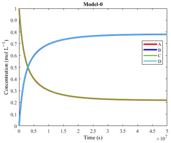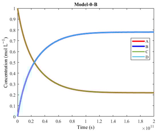 Plot of concentration vs. time of Model-0-B. A is converted to B (exergonic) and C is converted to D (endergonic), thanks to coupling. Model-0-B exclusively contains the R2 + R6 + R8 + R10 + R11 + R3 pathway, whereas Model-0 also includes other pathway possibilities featured in Figure 3.