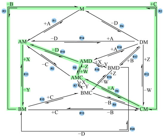 Reaction network of Model-1. The pathway highlighted in green (R2 + R6 + R8 + R10 + R11 + R3) is called Track 1 and it represents the following sequence in the direction of product synthesis: C + M → CM, CM + A → AMC, AMC + W → AMD + Z, AMD → AM + D, AM + X → BM + Y, BM → B + M. Each reaction is labelled with its own reaction name (e.g., R1). A and X are the reagents of the overall exergonic reaction, B and Y are its products. C and W are the reagent and product of the overall endergonic reaction, D and Z are its products. B and D are the products of interest whereas Y and Z are treated as waste. M acts as the complex coupling the reactions together. All possible reaction paths for an overall A-to-B (exergonic) and C-to-D (endergonic) conversion are featured. For the sake of readability, only one direction of each reaction is labelled with reagents binding to M and/or products being released from the complex (e.g., +A). It is implied that the reaction in the opposite direction has opposite signs for said species.