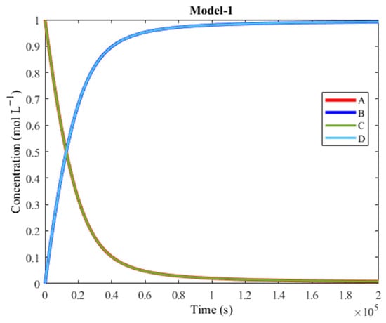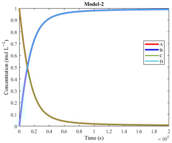 As seen in Figure 14, the plot of Model-3 is similar to those of Model-1 and Model-2, featuring an overlap between the products’ concentrations and an overlap between the reagents’ concentrations.