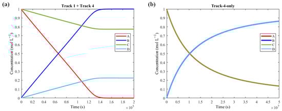 (a) Plot obtained by keeping all activation barriers high, except for Track 1 (R2 + R6 + R8 + R10 + R11 + R3) and Track 4 (R1 + R5 + R7 + R19 + R20 + R3), whose reaction steps have low activation barriers. (b) Plot obtained by keeping all activation barriers high, except for Track 4, whose reaction steps have low activation barriers. Overlap is observable. Coupling is therefore computationally possible with just Track 4, but it is very slow.