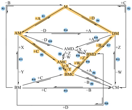 Reaction network with the same directionalities as the ones in Figure 6. The R2 + R6 + R8 + R18 + R20 + R3 pathway is highlighted in purple and is called Track 2. Track 2 represents the following sequence in the direction of product synthesis: C + M → CM, CM + A → AMC, AMC + W → AMD + Z, AMD + X → BMD + Y, BMD → BM + D, BM → B + M.