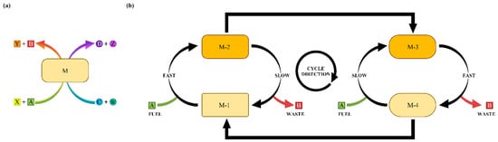 (a) Schematic representation of the Janusian enzyme, called M. A and X are the reagents of the exergonic reaction and B and Y are its products. C and W are the reagents of the endergonic reaction and D and Z are its products. M changes state when the other species are binding, allowing coupling to occur, resulting in the release of both B and D. The various states of M are omitted here because this scheme would otherwise become as intricate as the network in Figure 2. (b) Schematic representation of an information ratchet mechanism, like those studied by Leigh and collaborators [20], featuring A-to-B as the fuel-to-waste reaction. The ratchet changes states (M-1, M-2, M-3 and M-4) thanks to the following directional path: M-1 is converted to M-2, then it becomes M-3, which then relaxes to M-4.