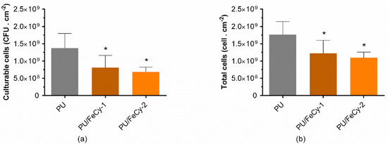 (a) Culturable and (b) total cells of C. marina biofilms formed on PU (control), PU/FeCy-1, and PU/FeCy-2 surfaces after 42 days. The asterisks represent statistical differences between PU and the PU/FeCy surfaces (p-values < 0.05).