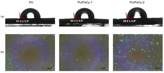 (a) Representative images of water contact angle measurements and (b) visual depictions (captured by the Optical Coherence Tomography (OCT) camera; scale bar = 1 mm) of PU (control), PU/FeCy-1, and PU/FeCy-2 surfaces.