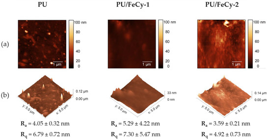 (a) Two-dimensional and (b) three-dimensional AFM images of PU (control), PU/FeCy-1, and PU/FeCy-2 surfaces, including absolute average (Ra) and root mean square (Rq) values. All images correspond to a 5 × 5 µm2 surface area.