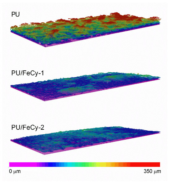 The topographical properties of the PU, PU/FeCy-1, and PU/FeCy-2 surfaces were evaluated by AFM using a PicoSPM LE system (Molecular Imaging) and Agilent Technologies PicoView 1.14.4 software (Keysight Technologies, Santa Rosa, CA, USA). The images were obtained in air, at room temperature, in HQ:NSC35/Hard/Al BS-C μmasch® dynamic mode. The surface roughness values were obtained using Gwyddion® software (version 2.67) and represent the average values calculated from measurements taken on three distinct samples.