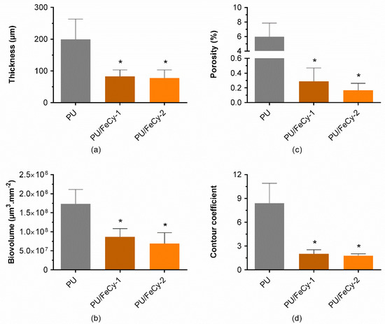 (a) Thickness, (b) porosity, (c) contour coefficient, and (d) biovolume of C. marina biofilms formed on PU (control), PU/FeCy-1, and PU/FeCy-2 surfaces after 42 days. The asterisks represent statistical differences between PU and PU/FeCy surfaces (p-values < 0.05).
