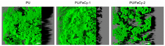 The antibiofilm potential of the PU/FeCy-1 and PU/FeCy-2 surfaces was demonstrated by a significant decrease in biofilm thickness and biovolume compared to the control (Figure 6a,b). The thickness values obtained were similar (83 ± 20 µm and 77 ± 26 µm for PU/FeCy-1 and PU/FeCy-2, respectively) and significantly lower than those of the control PU (199 ± 64 µm, p < 0.05, Figure 6a). This represents reductions of 58% and 61% for PU/FeCy-1 and PU/FeCy-2, respectively. Accordingly, the biovolume was significantly lower for biofilms formed on the PU-based coatings containing 1 wt.% of complexes FeCy-1 and FeCy-2 (p < 0.05, Figure 6b), achieving reductions of 50% for PU/FeCy-1 and 60% for PU/FeCy-2.
