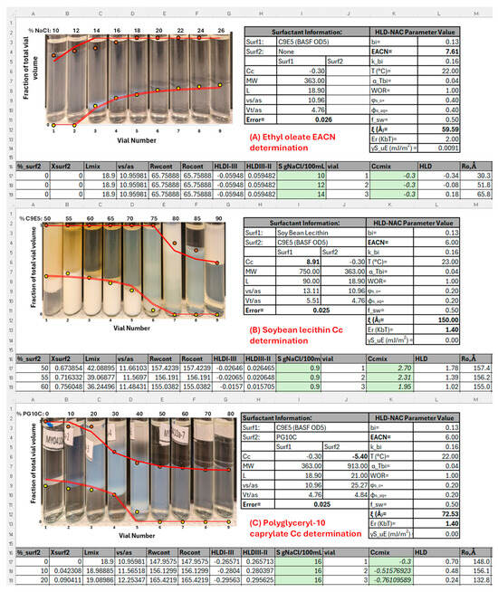 A salinity scan was conducted to estimate the EACN of ethyl oleate (EOL) using the surfactant C9E5 at 40 wt% in the aqueous phase, a water-to-oil ratio (WOR) of 1:1, and a total volume of 6 mL. For C9E5 concentrations of 20 wt% or higher, the characteristic curvature (Cc) was −0.3, determined via salinity scans with limonene as the oil phase. All vials were gently agitated and allowed to equilibrate for two weeks before any observations were recorded. Phase volumes were then analyzed using a modified HLD–NAC model Excel spreadsheet to fit EACN and ξ [16].