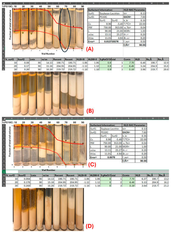 Phase behavior studies of mixtures of lecithin (Le) and hydrophilic linker (HL, PG10C) were conducted to determine the lecithin-to-hydrophilic linker ratio required to produce water-dilutable µEs with the maximum possible oil solubilization. To estimate the HLD–NAC parameters L and ξ for lecithin-linker µEs, the Le-PG10C composition scan shown in Figure 3A was performed using EOL as the oil phase. The inversion points from water-in-oil µEs (vials 1 through 5 in Figure 3A) to oil-in-water µEs (vials 7 through 9) predicted by the HLD–NAC model was set by the EACN and Cc parameters obtained in Figure 1. The parameters L and ξ only help to fit the water or oil solubilization capacity of the µEs. The value of L = 90 Å is consistent with the value of L obtained from other lecithin-linker µEs [9,13]. The relatively low value of ξ = 90 Å compared to previous Le–LL–HL µEs (with ξ~200 Å) is likely due to the lack of a lipophilic linker (LL) [13].