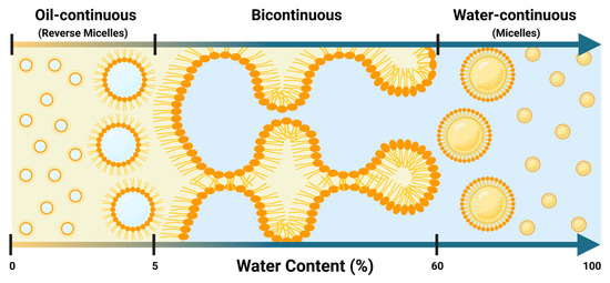 Schematic representation of lecithin-linker µEs (LLMs) transitioning from oil-continuous (reverse micellar) structures to bicontinuous phases at approximately 5% water content and from bicontinuous to micellar (water-continuous) systems at around 60% water content, according to the information in Figure 7 (Created in BioRender. Doratt, J., accessed on 4 January 2025, https://BioRender.com/a21a732).