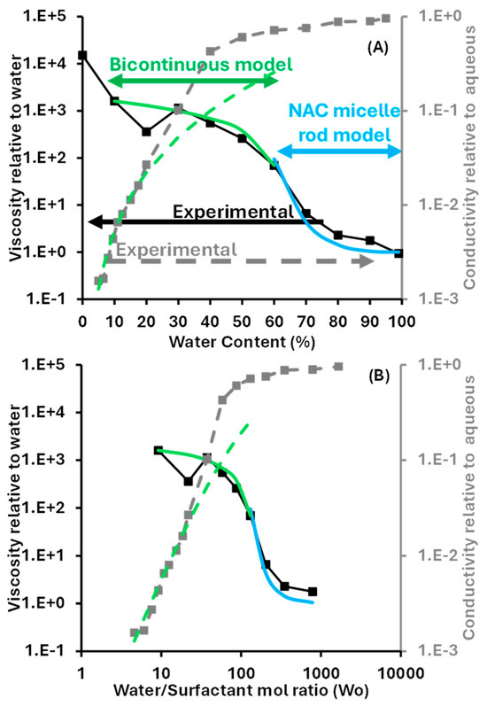Figure 7 shows the relative conductivity and viscosity of LLMs (SDL = 60 in Figure 4) as a function of the aqueous phase content (Figure 7A) and the water-to-surfactant molar ratio (Wo, Figure 7B). The reference conductivity was the conductivity of water containing the same electrolyte concentration (based on total volume) as the diluted µEs, and the reference viscosity was the viscosity of water at 20 °C. The green lines were obtained using equations developed for bicontinuous polymer systems. The relative conductivity (σrelative) was predicted as [19]: