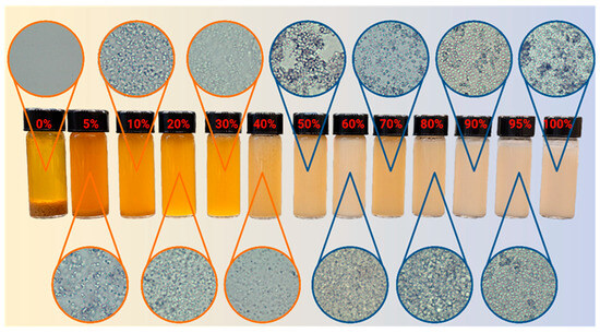 Figure 8 illustrates the dispersibility of yeast (Saccharomyces cerevisiae) in LLMs obtained along the D60 dilution line, with an increasing aqueous phase from 0% to 100%. At a 0% aqueous phase, the yeast was unable to disperse, settling at the bottom of the vial. When a sample was taken from the middle of the vial, 15 min after 8% of yeast was dispersed, no yeast cells were observed, suggesting that yeast may not be activated in water-free systems and remain dormant in a dry state. At a 5 wt% aqueous phase, a significant portion of the cells remained suspended in the system, suggesting that yeast was activated in those systems. Yeast cells require a water activity of at least 0.61 to be activated [23]. Although water activity was not measured, previous studies with ionic µEs reveal that, at water-to-surfactant mol ratio (Wo) as small as 2.5 (~3 wt% aqueous in LLMs), the activity of water is 0.79 [24]. This suggests that, for LLMs with 5% water, yeast cells are activated (and suspended in the process), which is to be expected considering that instant dry yeast cells were used in this study. Full and stable yeast dispersion was achieved from 20% aqueous content and above. From 30 to 60 wt% aqueous, the micrographs showed yeast clusters in bicontinuous µEs. For the water-continuous µEs (>60 wt% aqueous), the cells were homogeneously dispersed.