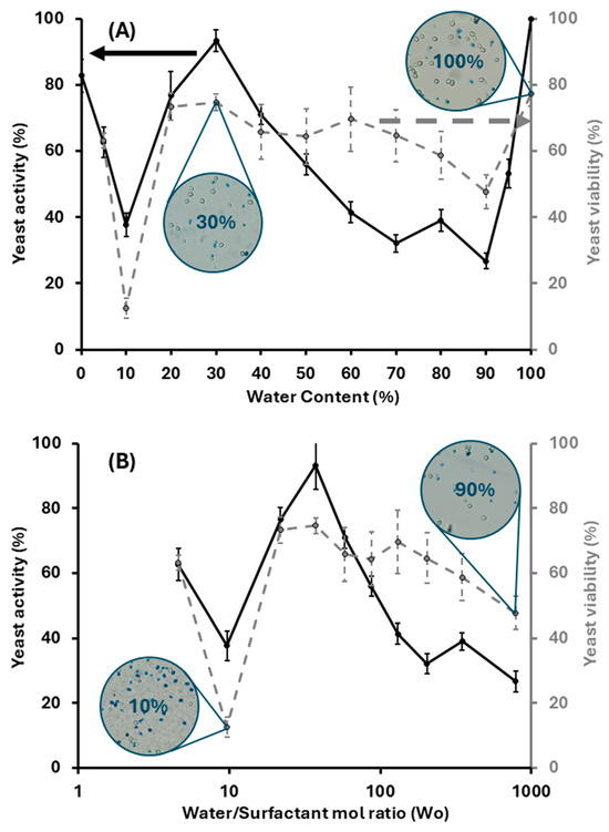 Yeast activity and viability as a function of water content (A) and water-to-surfactant ratio, Wo, (B)—along the dilution line D60 illustrated in Figure 4. The left vertical axis (black solid line) represents yeast activity, measured by the amount of CO2 produced over 24 h after feeding the yeast-loaded (loading: 8% w/w) LLMs (previously exposed to the formulation for 24 h with a 25% w/v sucrose solution. The right vertical axis (gray dashed line) shows yeast viability following the same exposure and feeding protocol. The viability was determined by staining the dead yeast cells with a 0.1% aqueous methylene blue, as shown in the micrographs for the LLM systems containing 10%, 30%, 90% and 100% of the aqueous phase.