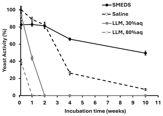 For the LLM with 30% aqueous phase, it is remarkable that the yeast was still active after 1 week of incubation, answering part of the research question that LLMs can extend the survival of unacclimatized yeast beyond the 3 days reported for other µE formulations1. The D60 SMEDS (0% LLM) shows a gradual decline in activity, decreasing from 82.73 ± 4.99 in Week 0 to 49.50 ± 2.46 by Week 10. This observation then answers the second part of the research question that SMEDS can substantially extend the survival of unacclimatized yeast beyond the 3 days reported for previous µE formulations. The slow decrease in yeast activity in SMEDS, compared to the LLMs, is likely associated with the low water activity in the D60 SMEDS since yeast cells are known to remain dormant when the water activity is lower than 0.61 [23]. Recent work shows that when yeast cells enter a dormancy stage due to dehydration (the process used to make dry powder yeast), the cells enter a solid-like state triggered by an acidification of the cytoplasm that results in a widespread macromolecular assembly of proteins and sugars, causing the cytoplasm to gel [29]. Since dry powder yeast cells are added to SMEDS (no water added), then, as long as the SMEDS remain dry, the lack of water keeps the yeast dormant. The gradual loss of yeast activity in SMEDS might be associated with water absorption from air over the 10-week period since the formulation was stored in ambient air (T~25 °C, ~50% relative humidity), protected with Parafilm™ film, which has low but non-zero water vapor permeability [30]. One fundamental difference between dry yeast powder (that remains stable for one year or more if the package seal is not compromised) and the yeast in SMEDS is that the yeast powder does not have nutrients, thus absorption of water from air is not likely to result in activation. However, in SMEDS, lecithin and EOL are nutrients, and the absorption of water from air is likely to result in premature yeast activation. Future stability tests are planned to keep track of water activity in SMEDS under different storage conditions and its impact on cell viability and activity. If water absorption is involved, then appropriate storage and packing/sealing must be considered.